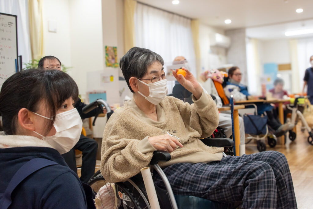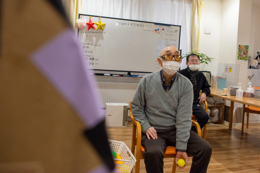「鬼だ〜!」という声とともに、利用者の皆様は豆を手に取り、思いっきり鬼へと投げつけました。「鬼はー外!」の掛け声と笑い声が響き渡り、施設内は一気に節分ムード一色に。びっくりした様子も見られましたが、それもまた節分ならではの楽しさです!