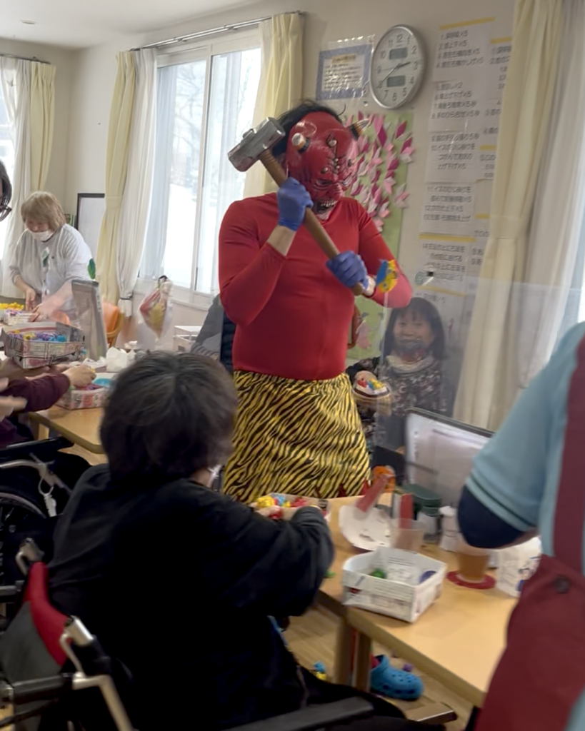 舎の灯では本格的な節分の雰囲気を楽しみました。なんと、赤鬼の衣装とお面に身を包んだ職員が登場!
