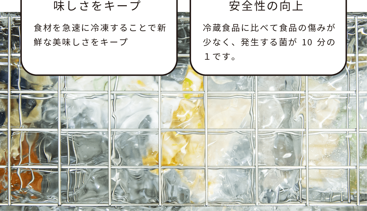 専属の栄養士が開発したメニューを、調理師免許保持者のみが調理したお食事を-30℃の液体で急速に凍結させることで、より美味しさが保たれたお食事をご提供します。